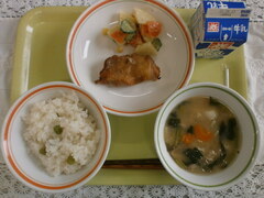 6日(金曜日) グリンピースご飯・鶏の照り焼き・ポテトサラダ・豚汁・牛乳