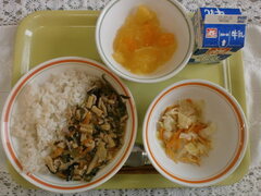 3年生が今週末修学旅行で行く「奈良県」の料理を取り入れました。「色ご飯」は奈良県の家庭料理で、しょうゆ味の炊き込みご飯のことです。奈良県ではこの「色ご飯」がスーパー等でも売られているほどなじみ深い料理だそうです。また、奈良県の吉野山が「葛」の産地であることから、くず粉でとろみをつけた汁のことを「吉野汁」といいます。給食室でもくず粉を使用して作りました。