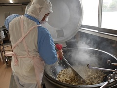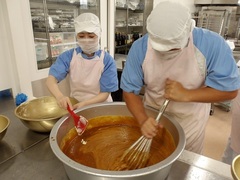 大量の大根おろしはみりんや酢、砂糖、しょうゆで味付けして煮詰めます。教室で配膳の時にスパゲティにかけます。