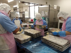 今日は、お彼岸に合わせておはぎを作りました。お彼岸は春と秋で年に2回ありますが、秋のお彼岸は9月23日の「秋分の日」をはさんで前後3日間を合わせた1週間のことを言い、昔からおはぎをお供えする習慣があります。おはぎは、もち米とうるち米を混ぜて炊いたご飯を、米粒が残る程度に軽くつぶして丸め、あんこやきな粉で包んだ食べ物です。「おはぎ」という名前は、秋のお彼岸の頃に咲く「萩」の花が由来と言われています。」今日は、普通のきな粉とうぐいすきな粉の、2種類のきな粉をまぶしたおはぎを作りました。生徒の様子を見ていると、普通のきな粉の方が若干人気があったようでした。