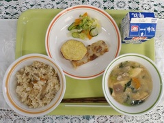 今日は、1年生が29日に校外学習で行く「川越」のある「埼玉県」にちなんだ料理です。川越と言えば「さつま芋」が有名ですが、それは昔、江戸で焼き芋が大流行したのがきっかけでした。さつま芋の栽培が盛んになり、中でも川越の芋は質が良く、また、川越からは江戸に運びやすかったこともあり、さつま芋の大産地になったそうです。今日は、さつま芋を天ぷらにしました。糧飯は、米の生産量が少ない地域で、ご飯の量を増やすために具材を加えたことからできた料理とされています。呉汁は、柔らかくしてすりつぶした大豆を入れた汁で、昔から愛されてきた庶民の日常食です。今日は天ぷら(特にさつま芋)が人気で、ほとんどのクラスが完食でした。