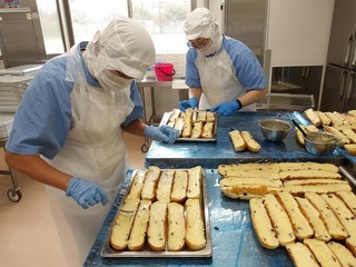 レーズンは干しぶどうとも呼ばれ、その名の通りぶどうを皮ごと乾燥させて作るドライフルーツの一種です。レーズンが発見されたのは紀元前のことで、木になったまま自然に乾燥したぶどうを誰かが見つけたのが始まりだそうです。原料となるぶどうの品種や産地の違いで、レーズンにもいつくか種類があります。日本で最も多く食べられているレーズンはカリフォルニア・レーズンで、緑色で皮の薄い種なしぶどうを天日干しして作られています。レーズンは小さいですが、鉄分やカリウム、食物繊維など、一粒に栄養素が凝縮されています。今日は細長いレーズンパンにシュガーマーガリンを塗ってふんわりと焼きました。