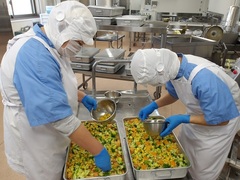ドレッシングで和えて、のりとごまは生徒が食べる頃まで食感や風味を損なわないようにシートを敷いて盛り付けました。