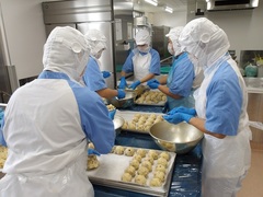 11月は読書月間なので、給食でも本に出てくる料理を提供します。今回は、読書部の皆さんが本を推薦してくれています。今日は、「給食のおにいさん」という本に出てくる「里芋とレンコンのクロケット・サラダ仕立て」を作りました。この料理は、この本の中で学校給食調理コンテストに応募したメニューとして出てきます。クリーム状にした里芋で作ったクロケットを、フレンチドレッシングで和えたサラダにのせた料理です。レンコンは本当は衣として使うのですが、実際に作るのは難しいので中の具に混ぜました。野菜はあまり人気ではなかったようですが、クロケットは好評でした。本を読んだイメージで作ったので、ぜひ生徒の皆さんにも本を読んでもらって、どんな料理なのか想像してみてほしいです。