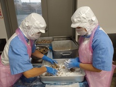 今日は195個の卵を使いました。1個ずつ殻が入らないように割ります。