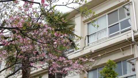 今年は暖かい春が早く来たので、本校自慢の藤棚が今、満開です。同時にツツジやハナミズキも咲きはじめ、中庭がとてもきれいです。 来年は見ることが出来ないかもしれないので、とどめておきたい春の景色です。