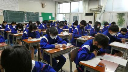 1年生は初めての定期テストです。1学期の中間テストは範囲が少ないので、今年度から1日で実施しています。計画表を毎日担任に提出して家庭学習に取り組んできました。成果が出るといいですね。
