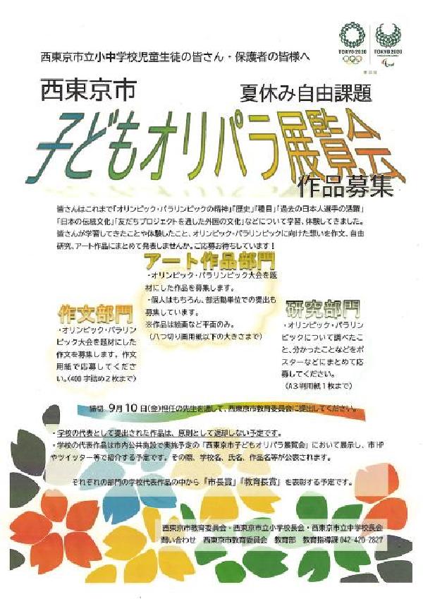 西東京市では、夏休みの自由課題として「子どもオリパラ展覧会」の作品を募集します。生徒たちには、昨日案内を配布しました。夏休みの期間を利用して、これまで学習してきたことや体験したこと、オリンピック・パラリンピックに向けた想いを【作文】【自由研究】【アート作品】として発表してみてください。取組は任意ですが、たくさんの応募を待っています。