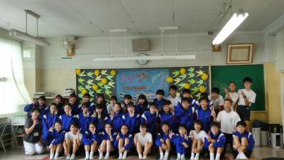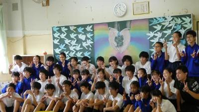 タブレットと投影機を使い、黒板に下絵を映して下書きをしました。分担して色を塗り、ひばりの形のカードに、感謝のメッセージを一人一人書いたものを作品の周りに張って完成!