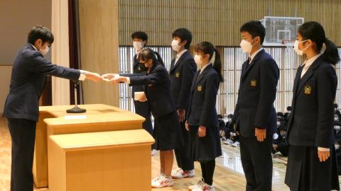 生徒会長から、各委員長に認承証を手渡ししました。後期の委員会の委員のみなさん、ひばりが丘中学校の生徒と学校のためによろしくお願いします。