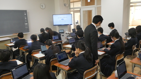 1年生は、タブレットの使い方は小学校で十分学習していますが、中学校で改めて使い方を学習しました。 eライブラリの学習の方法を知り、学校だけでなく家庭学習でも行うように指導しました。