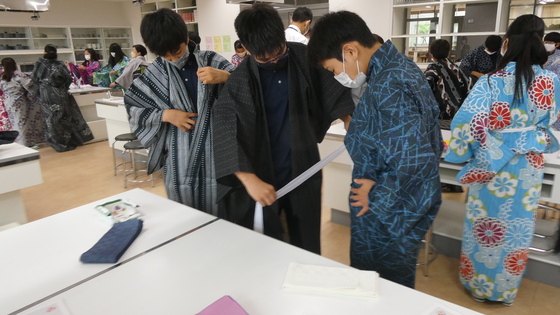 毎年、1年生の家庭科では浴衣の着付けを行い、日本の着物文化に触れています。今年は外部の着物教室の先生方をおよびし、全員が着物の着付け体験をしました。