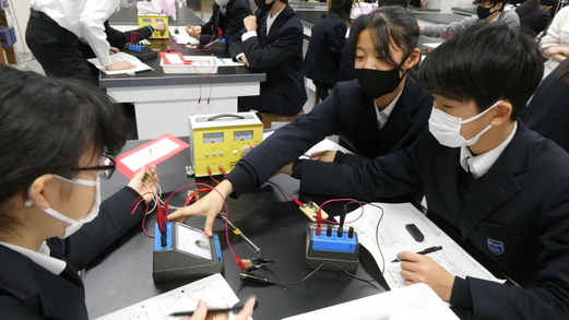 回路の電圧と電流の関係を調べる実験をしています。電源装置の使い方を学習してから実験をしました。