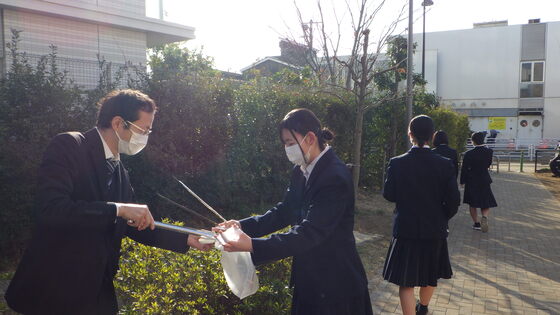 水曜日の朝、生徒会があいさつ運動をしていますが、この日は、生徒会が全校生徒へゴミ拾いボランティアを募り、校舎の周りのゴミ拾いを行いました。 毎朝、学校の周辺に捨てられているゴミ拾いをする教員を見ていて、自分たちもやりたいと考えました。 来週は、トルコとシリアの大地震の募金を実施する予定です。