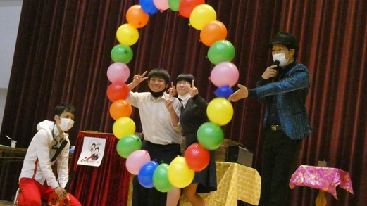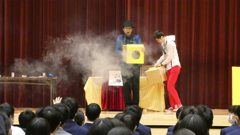 本校では、キャラメルマシーンというエンターテナーの方をおよびし、サイエンスショーを実施しました。