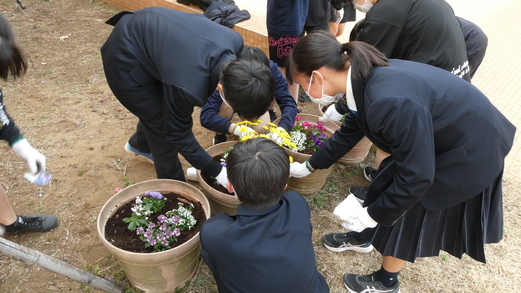 育成会「ひばり」の方々と一緒に中庭に花を植えました。今年度の後期ボランティア委員会の活動の最後になりました。育成会の方に教えてもらいながら、プランターの土の入れ替え、地植えの土の耕し、花植え、水やり、片付けまで行いました。