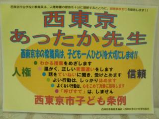 西東京市は教職員が人権尊重の理念を十分に理解するとともに、常に生徒一人一人の心に寄り添うことのできる教職員であるために、ポスター「西東京あったか先生」を作成しました。本校でも、その主旨を徹底し、全校で掲示しています。