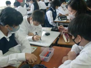 小グループで教科書や資料から縄文時代の人々の生活の様子をホワイトボードに絵で表現してみる(主体的に取