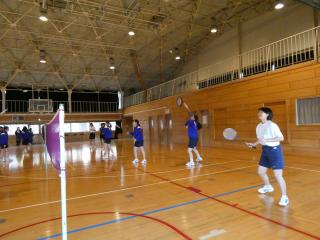 本日の目標「バトミントンのシングルスのラケット操作や守備時の動きについて考え攻防できる力を高める」ことを確認する。(めあてをつかむ)