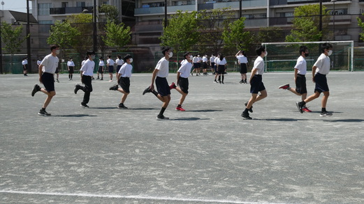 ひばりが丘中学校の伝統の準備体操「ひばりランニング」を、3年生が1年生に教える授業を行いました。毎年、先輩の3年生が後輩の1年生に教えることで、3年生は上級生の意識を強くもつことができ、1年生は上級生に教えてもらうことで、ひばりが丘中学校の一員になった自覚をもつことができます。さらに3年生は、本校の伝統を引き継ぐ役割を果たすこともできています。