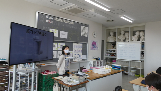 「陰影を描き分けて立体感を出そう」という目標で、今日は紙コップと白いリボンのデッサンをしています。最初にグレースケールを学習し、既に円柱、球、立方体をデッサンしています。最終的には体育館履きを描きます。