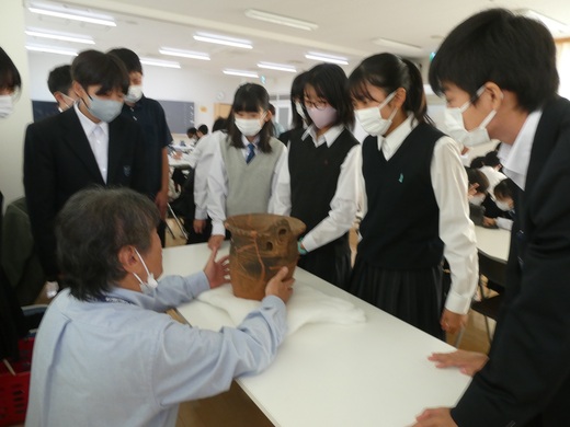 西東京市社会教育課の学芸員の方々にお越しいただき、国指定の縄文中期の大集落跡「下野谷遺跡」についてお話しいただきました、各クラス、IJ学級にそれぞれ1時間ずつ講演し、遺跡のバーチャル体験もできました。本市の貴重な縄文遺跡のことを知り、約5000年前の西東京市の場所に生活していた人々のことに思いをはせるのはとても楽しいものでした。