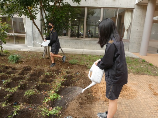 校庭西側のフェンス近くに100本ほどのサツキが植えられていますが、これを校舎北側に植え替えました。運動会の保護者観覧場所を少しでも広く確保したいと考えてのことです。9月の終わりから、用務主事さんが少しずつ植え替えていましたが、本数も多いので、テニス部、バレーボール部の生徒たちが手伝うことになりました。