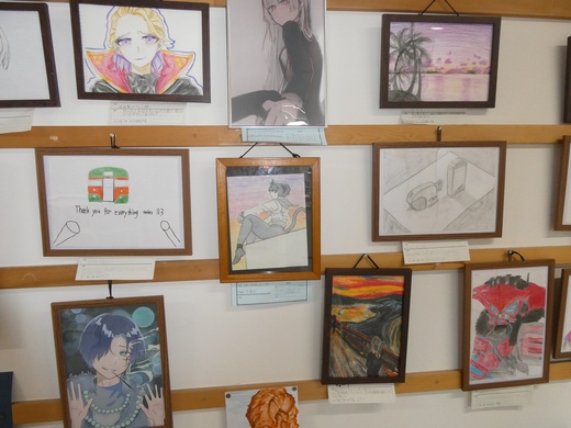 今年も、職員室前に美術部の制作した作品を展示しています。力作が多く、生徒も足を止めて見ています。各種コンクールの出品作品など、力作揃いです。