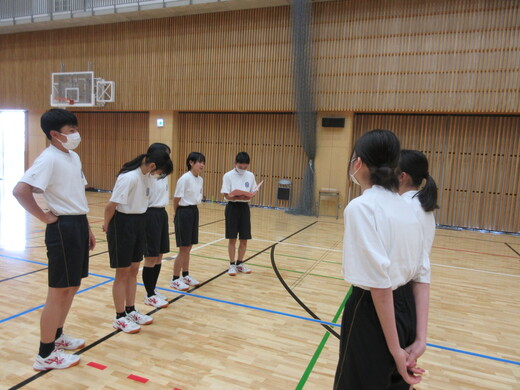 ひばりが丘中学校の伝統の準備体操「ひばりランニング」を、3年生が1年生に教える授業を行いました。毎年、先輩の3年生が後輩の1年生に教えることで、3年生は上級生の意識を強くもつことができ、1年生は上級生に教えてもらうことで、ひばりが丘中学校の一員になった自覚をもつことができます。さらに3年生は、本校の伝統を引き継ぐ役割を果たすこともできています。