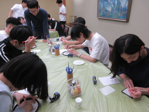 2日目夕方、京都の宿舎(石長)に時間通り、全班が戻りました。夕飯、お風呂、そして絵付けの体験学習と忙しい夜を過ごしました。京都の人の多さに、生徒たちはかなり疲れたようでした。