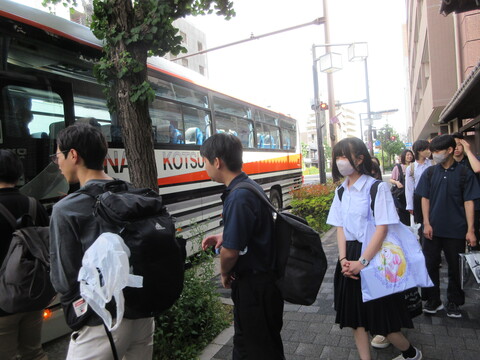 大きな荷物をトラックに積み込んでから出発です。IJ学級はロビーで宿舎の方にお礼をしてからバスで出発です。
