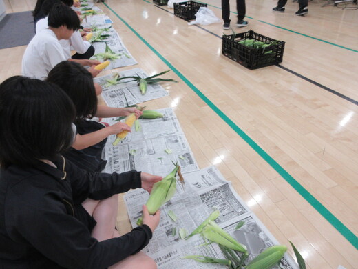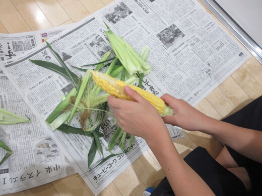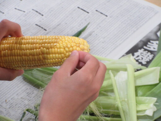 作業の授業「給食のトウモロコシの皮むき」(IJ学級)