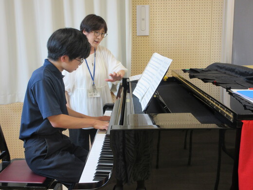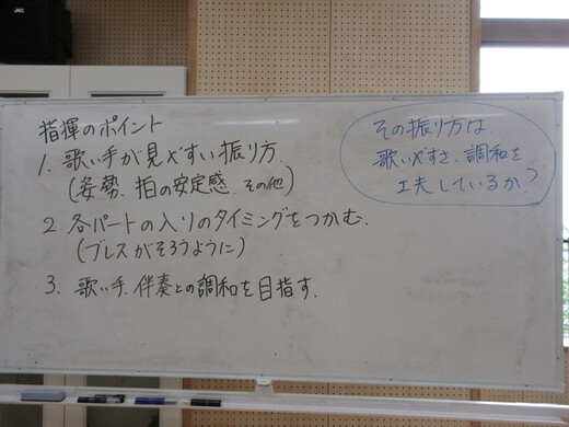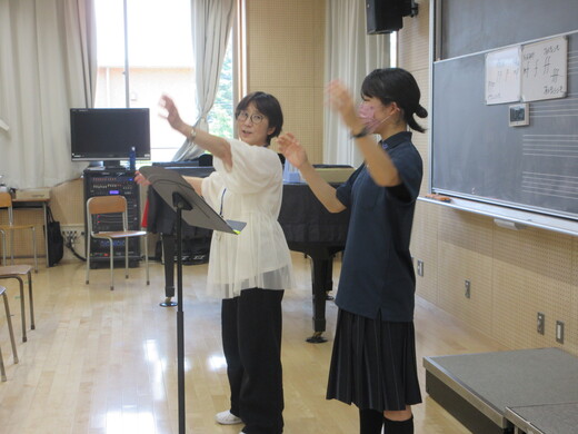 10月の合唱祭に向けて、指揮者と伴奏者50人が、夏休み中に、音楽の先生の指導を受けています。夏休み前に各学級で決めた指揮者と伴奏者は、この休み中から本格的に練習を開始しています。暑い中、頑張っています。
