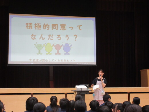 保健室の先生から、人と人との関係で、自分が嫌だと思うことは絶対にさせないこと、「積極的同意」について話がありました。相手を思いやる人間関係の基本を学びました。