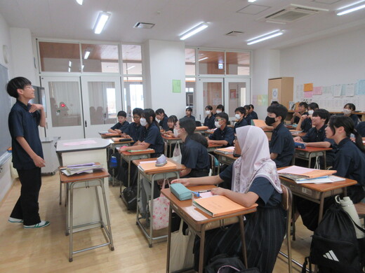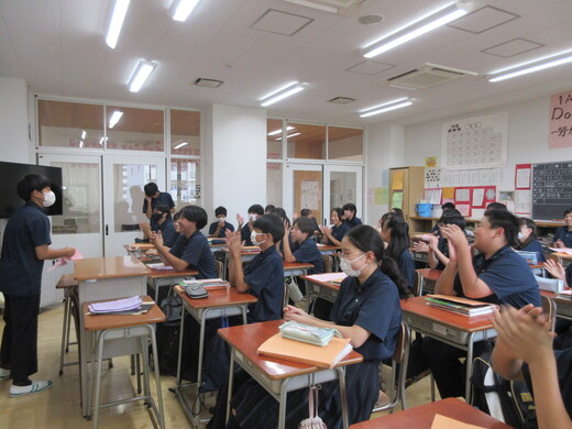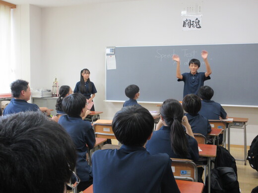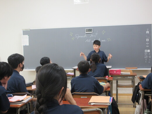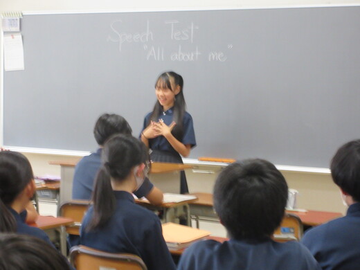 「私のことについて」のスピーチをしています。好きなスポーツや好きな趣味などについて発表できました。聞く人たちも、「はーい」「おー」などあいづちの反応がとてもよくできていました。