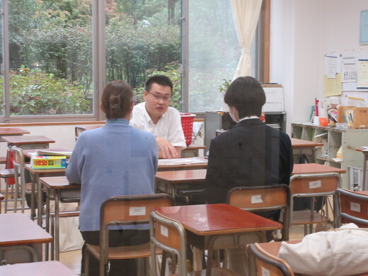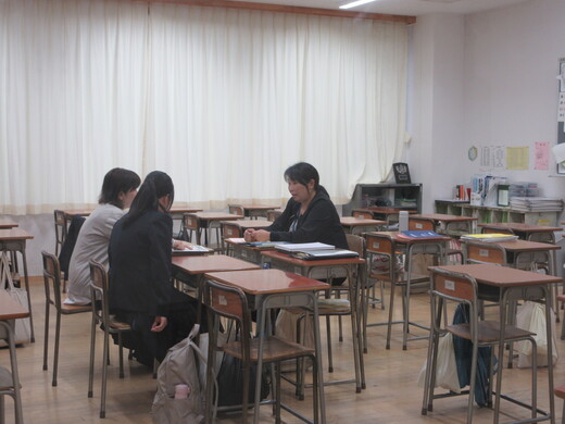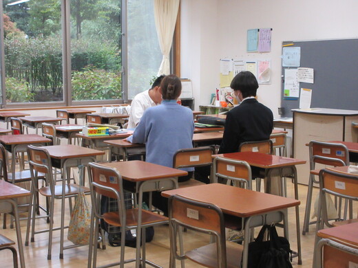 3年生は、夏休みから2学期にかけて、学校説明会、部活動体験、文化祭など、実際に志望校の見学や体験をしている生徒が多いです。今回の面談では、志望校の確認、学習のアドバイスなど、担任が一人一人の適切な進路選択に向けて、生徒、保護者の方と三者で話し合いをしています。 面談が終わっても、何かご心配なことがありましたら、どうか遠慮なくご相談ください。