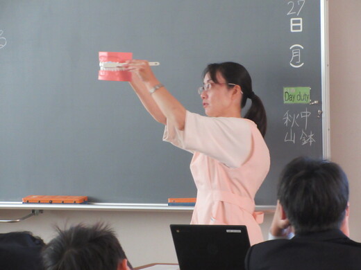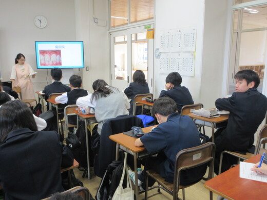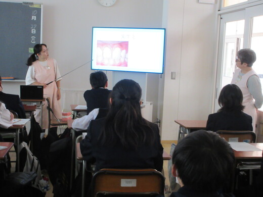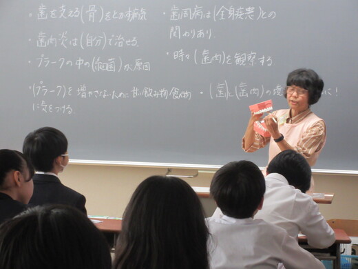 西東京市健康課歯科衛生士の方々に来ていただき、歯科教室を実施しました。今年度も感染防止のため、歯の観察や染め出し、ブラッシング指導は実施せず、講義中心で行いました。 歯周病の説明はとてもわかりやすかったです。口の中の細菌の多さには、驚きましたね。