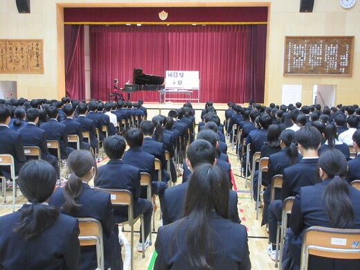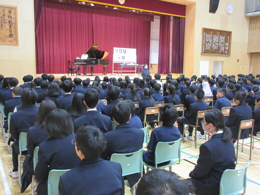 東京田無ロータリークラブの皆さまのご協力により、ピアノ公演会を行いました。令和2年から、年間で3校ずつ、市内の中学校で巡回演奏が行われています。本年度はひばりが丘中で行われました。