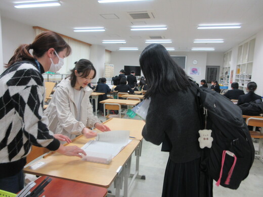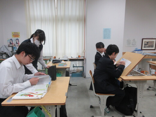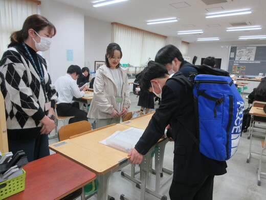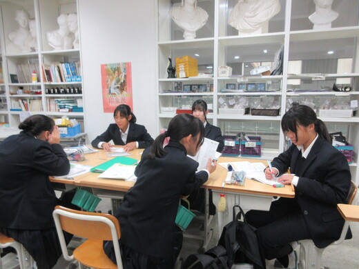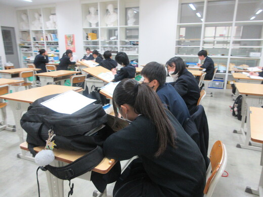 期末考査に向けて、自宅では集中して勉強ができない、友だちと一緒だったらはかどる、先生に質問をしたい、そんな生徒のために、今年から地域学校協働活動の1つとして、学校運営協議会委員の方や地域の方、そして保護者の方に運営をお願いし、中間考査に続き、期末考査前にも行っています。今回は部活動の見守りと同じように、主に保護者の方にお願いしています。時々、先生達も見回りに来て質問を受けています。