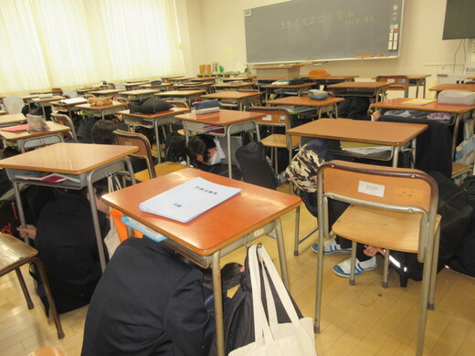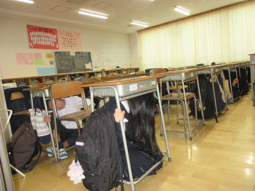 地震が発生した際の避難訓練を一時避難のみで実施しました。一時避難では机の下にもぐり、廊下にいる生徒は安全な場所に移動しその場に伏せるなど、自分の身を守ります。