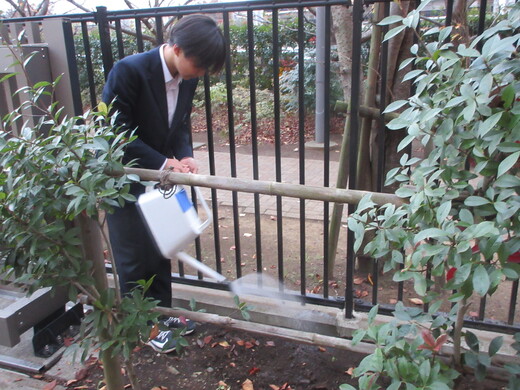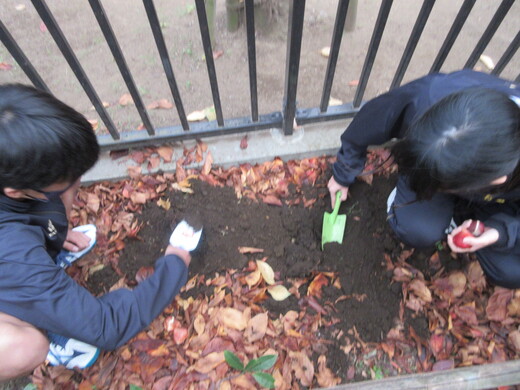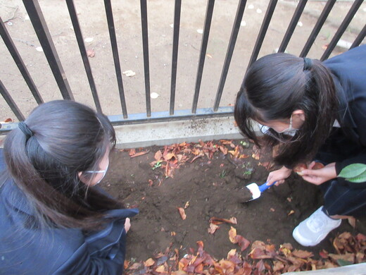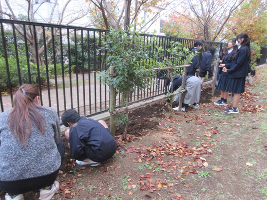 育成会「ひばり」の方々と一緒に、ボランティア委員会の生徒たちが年3回行っている花植えの作業ですが、2学期は教職員共済でチューリップの球根100個が当選したので、球根植えの作業を行いました。育成会の方に教えてもらいながら、土を耕したところに、球根を植え、水やり、片付けまで頑張りました。