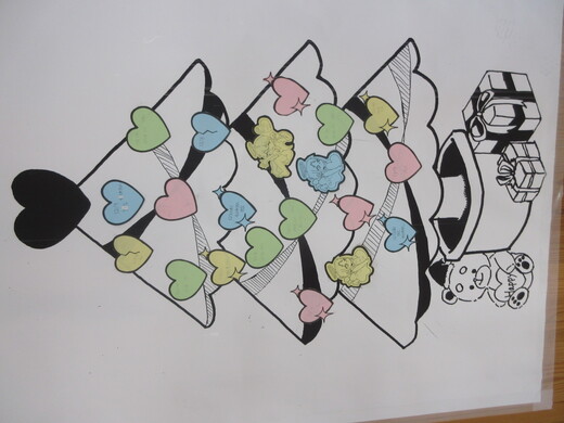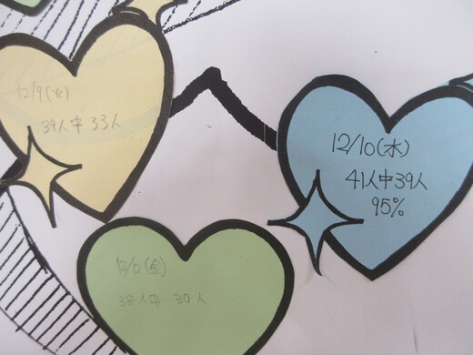 各教室にある写真のイラストのようにキレイに保っているロッカーの達成率で、形の異なるハートを学年の廊下のクリスマスツリーに貼っていきます。
