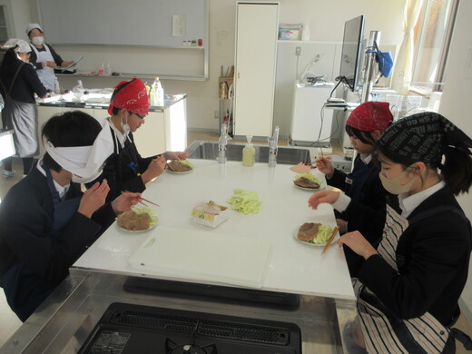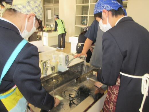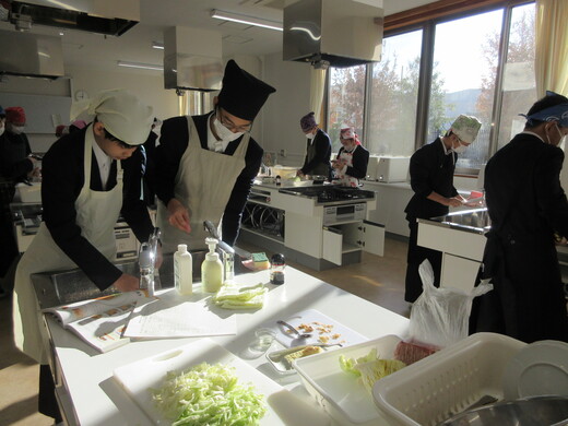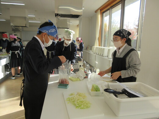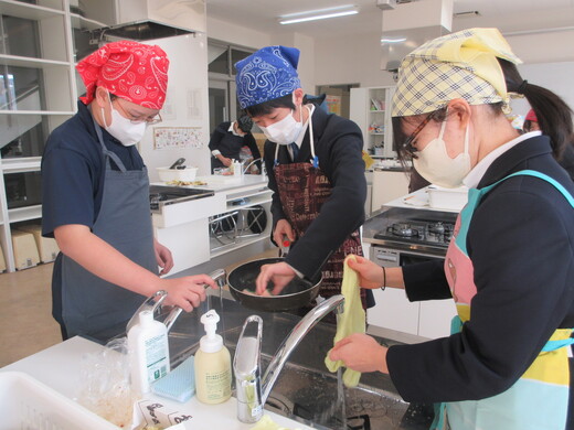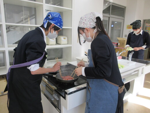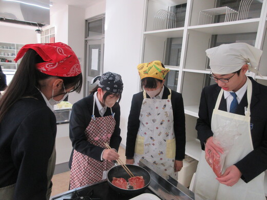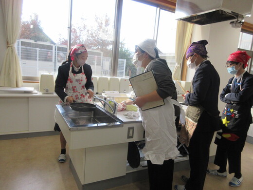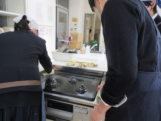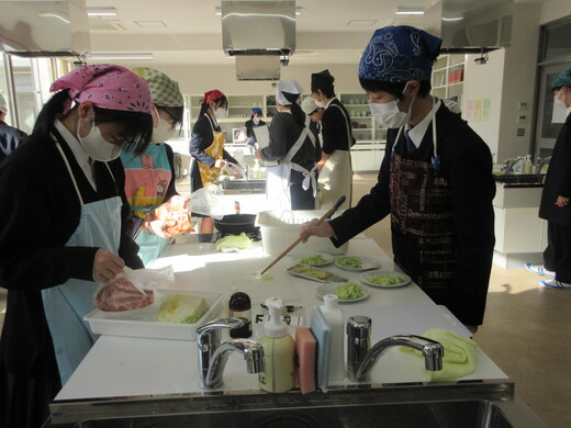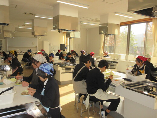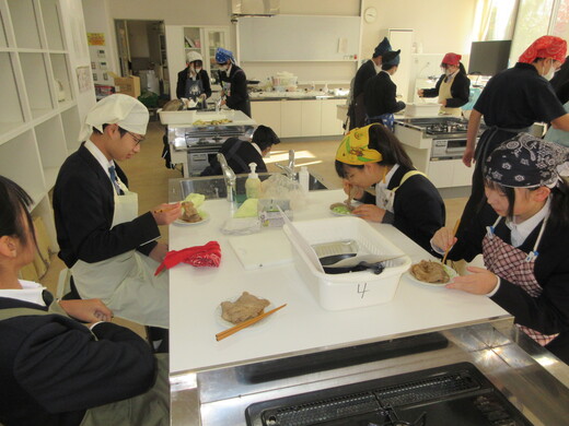 生姜焼きと千切りキャベツの調理実習をしました。3〜4名の班員で協力し合いながら行いました。ショウガの香りいっぱいのお肉が出来上がり、おいしく食べられました。中には、お肉を焼いた油でキャベツを手際よく炒めた班もありました。ほとんどの班が、使ったまな板や包丁、お皿をきれいに洗い、そしてコンロも磨いて終了できていましたが、50分ではなかなか時間が足りなくて、慌てて作業をしている班もありました。簡単で美味しいので、お家でぜひ作ってみましょう。