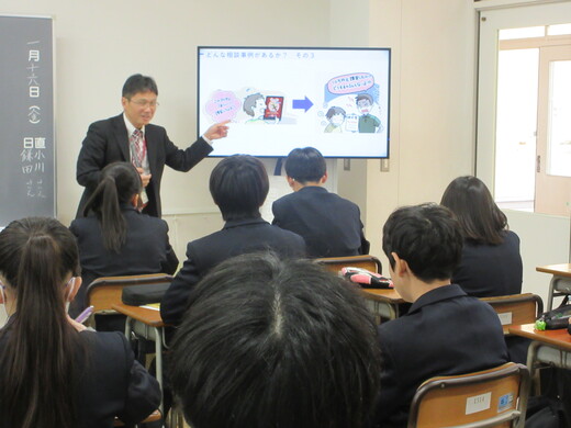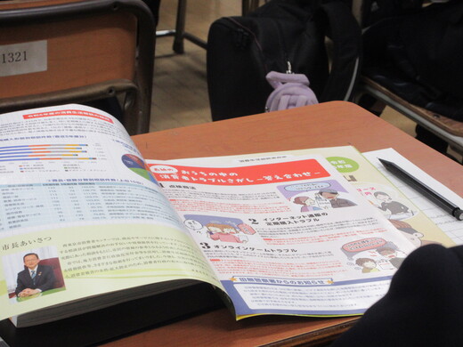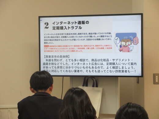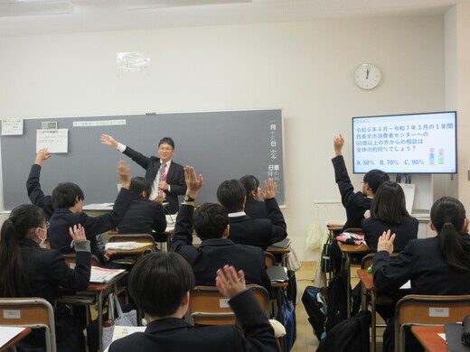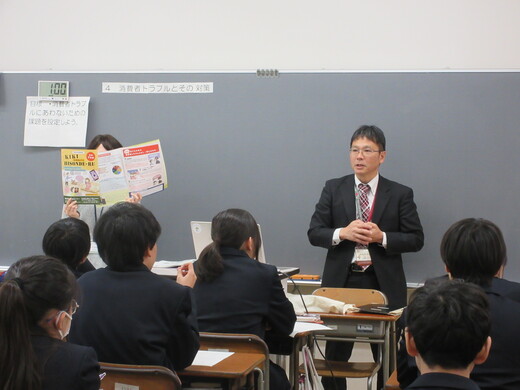 市内の家庭科教育研究会で、消費者教育に取り組んでいます。1年生の家庭科の授業で西東京市の消費者センターの方に来ていただき、授業をしていただきました。様々な消費者トラブル、特に若い人が騙されやすいネットの消費者トラブルなどについて、具体的な例や西東京市で実際にあった被害などのお話を交えながら、消費者教育の授業をしていただきました。