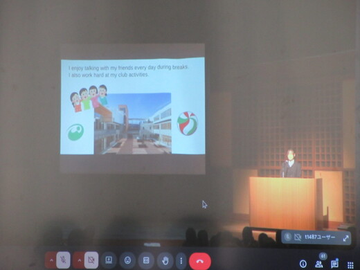 初めにバレー部の応援スライドが流れました。本校代表者は、 Seven Transfers, One Dreamをテーマに、引っ越した先で出会った人や、ひば りが丘中学校で学んだことから見つけた自分自身の夢を語りました。