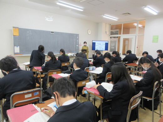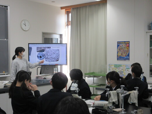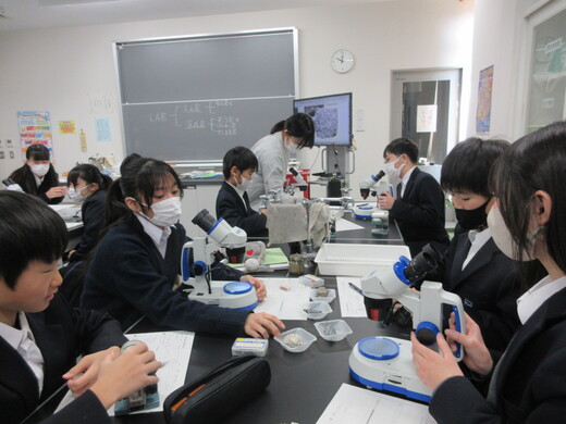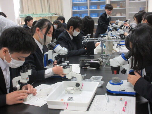 理科では「火成岩の特徴を観察する」授業です。顕微鏡を使い、火成岩の種類の特徴を観察しスケッチしました。次回は火成岩の種類をあてるテストを実施します。