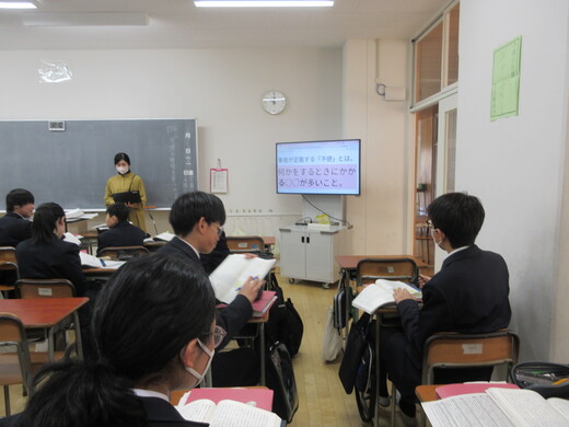 国語では、論説文「不便の価値を見つめよう」の読み取りと要約する授業を行っています。著者の主張やその根拠となる例などを1つ1つ読み取り、最後は200字で要約文を作成します。都立高校の国語の入試問題には、200字程度の文章を書く問題があります。