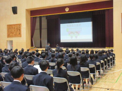 新入生が気持ちよく中学校生活のスタートをきれるようにするため、在校生が温かく迎える目的で、生徒会の入会式を行いました。