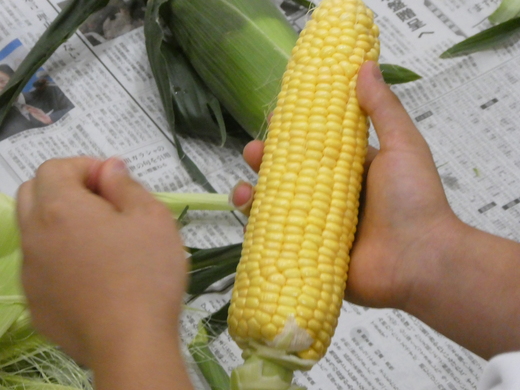 栄養士から、本日のトウモロコシの生産者の農家さんのお話しと、朝4時に収穫したばかりでとても甘いという話しなどがありました。そのあと作業の方法の説明をしてもらいました。