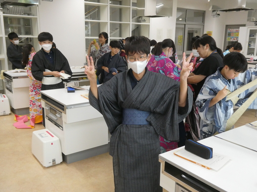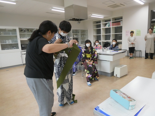 毎年、1年生の家庭科では浴衣の着付けを行い、日本の着物文化に触れています。今年も、学校運営協議会のコーディネーターにお願いして、6人もの地域の方で着付けのできる方が、お手伝いにきていただきました。おかげで全員が着物の着付け体験をすることができました。